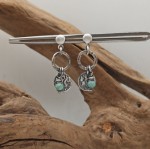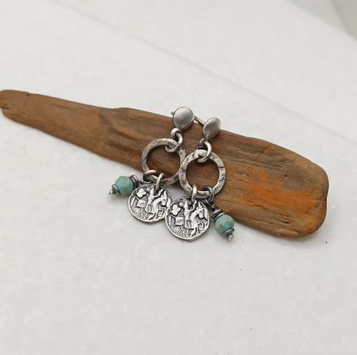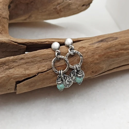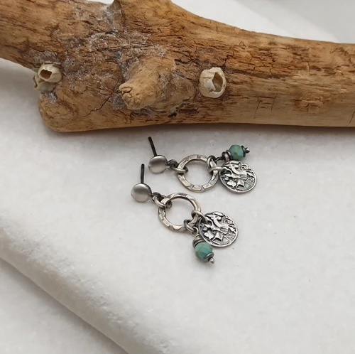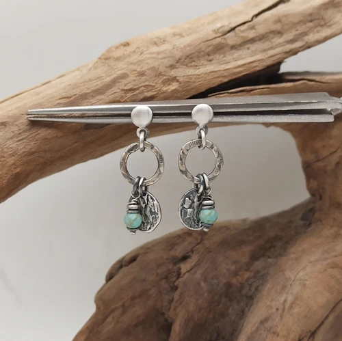 Te kolczyki to kwintesencja rękodzieła z duszą. Wykonane ze srebra próby 925, oksydowane i delikatnie przetarte, dzięki czemu nabrały szlachetnego, lekko postarzanego charakteru. Zapinane na wygodne sztyfty (śr.4mm), zdobione ozdobnymi kółkami (12mm), z których zwisają fakturowane blaszki (9mm) i maleńkie kulki fasetowanego turkusu.
