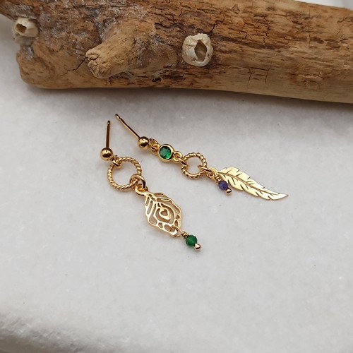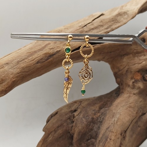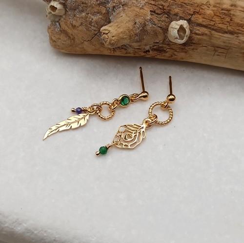 Kolczyki Feathers, krótkie, złocone, na sztyfcie, asymetryczne, zawieszki piórka, zielona cyrkonia w okuciu, ametyst, chalcedon