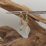 Delikatne kolczyki wiszące na sztyfcie, złocone, w stylu boho. Ozdobione finezyjnymi kółeczkami z zawieszkami w kształcie pawiego pióra i zwykłego piórka. Każdy detal subtelnie zdobi zielona cyrkonia w okuciu oraz drobniutki ametyst i zielony chalcedon. Idealne dla osób ceniących elegancję połączoną z naturalnymi inspiracjami. Kolczyki symbolizują lekkość, wolność i ochronę energetyczną, a ich intencją jest przyciąganie pozytywnej energii, harmonii i kreatywności. Doskonały wybór dla znaków zodiaku Waga, Strzelec i Ryby.