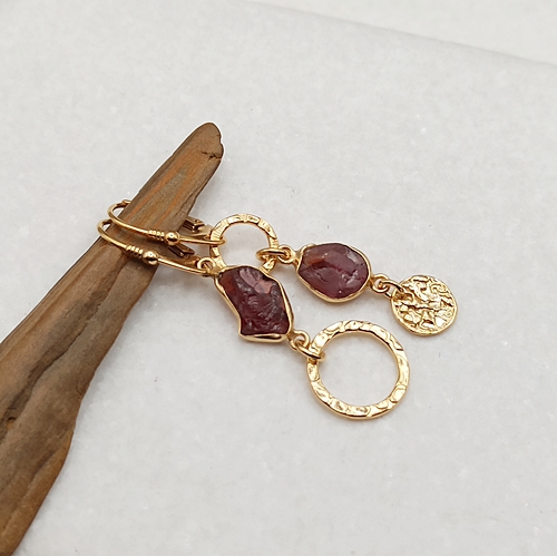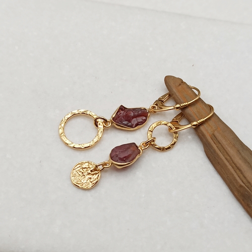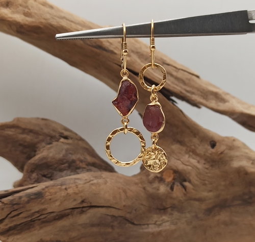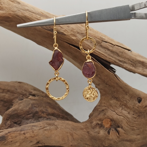 Kolczyki Garnet, wiszące,złocone, asymetryczne, surowe bryłki granatu, ozdobne kóła, blaszki