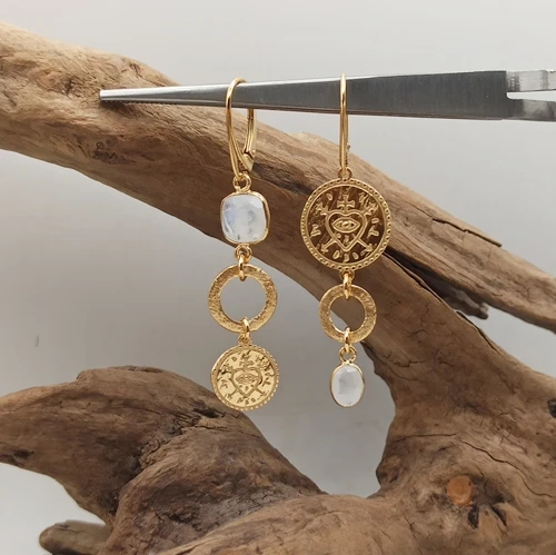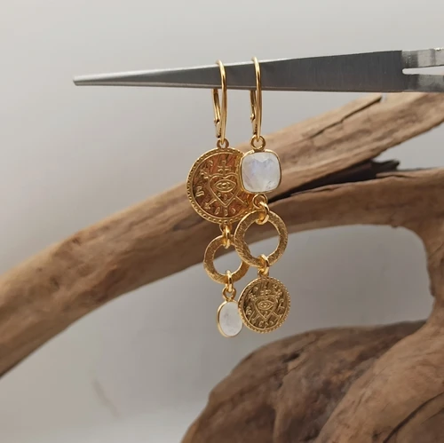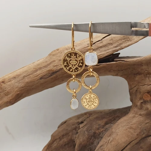 Kolczyki Moonlight, asymetryczne, złocone, wiszące, monety, kółka, kamień księżycowy