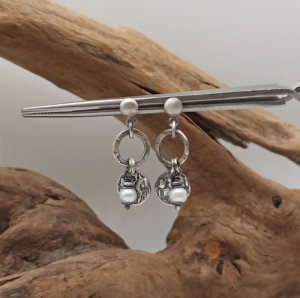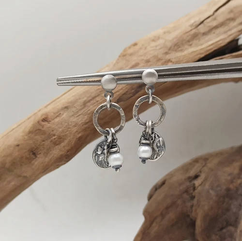 Kolczyki wykonane ręcznie ze srebra pr.925 oksydowane i delikatnie przetarte. Zawieszone na sztyftach 3mm. Fakturowane kółeczka śr.11mm i blaszki 9mm. Nieregularne perełki hodowane(ok.6x4mm). Zapakowane w pudełko firmowe.
