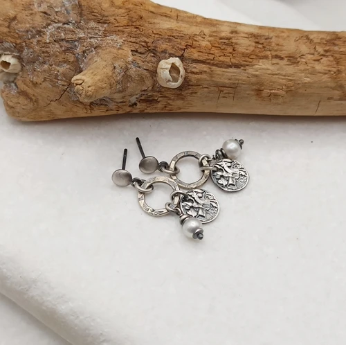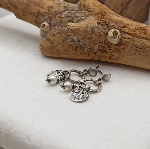 Wprowadź subtelny blask do swojej kolekcji biżuterii z tymi wyjątkowymi kolczykami sztyftami, wykonanymi ze srebra próby 925, oksydowanego i delikatnie przetartego, które doskonale eksponuje klasyczne piękno perły. Ręcznie formowane młotkowane kółka i zawieszki z surową fakturą nadają tym kolczykom artystycznego, nieco etnicznego charakteru, który pasuje zarówno do stylizacji boho, jak i eleganckiego minimalizmu.