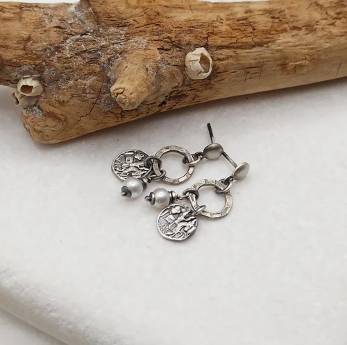 - Zawieszki: Blaszki z surową strukturą przypominające starożytne monety
