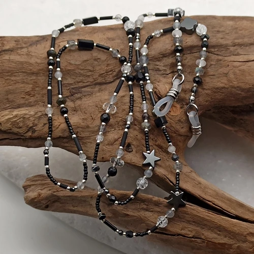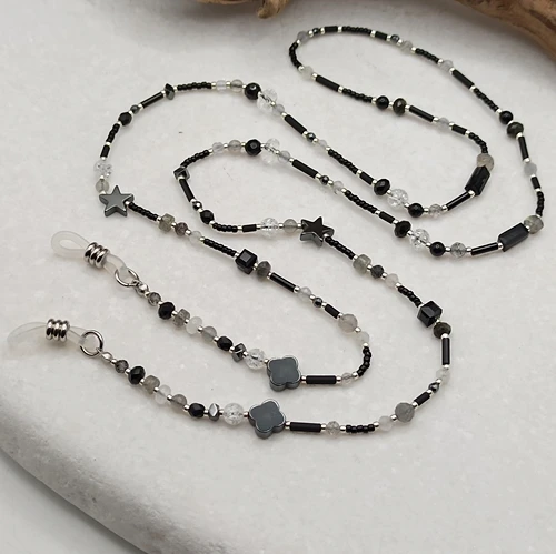 Ręcznie wykonany łańcuszek do okularów z naturalnych kamieni i czarnych koralików Toho - elegancki, nowoczesny dodatek o wyrazistym charakterze. Utrzymany w klasycznej, ponadczasowej kolorystyce czerni i srebra, doskonale łączy funkcjonalność z estetyką.
