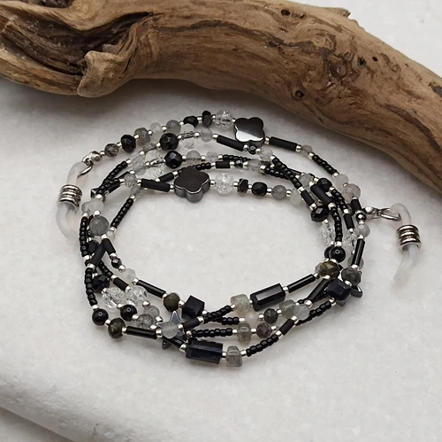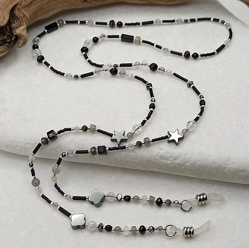Łańcuszek do okularów Black Silver, czarny, z kamieni naturalnych i koralików toho, labradoryt, kwarc, spinel, onyks