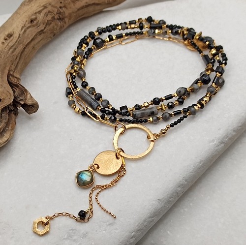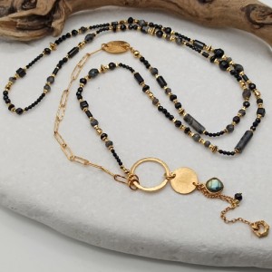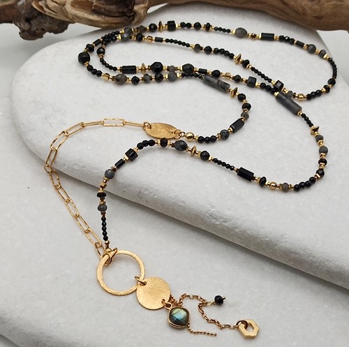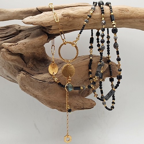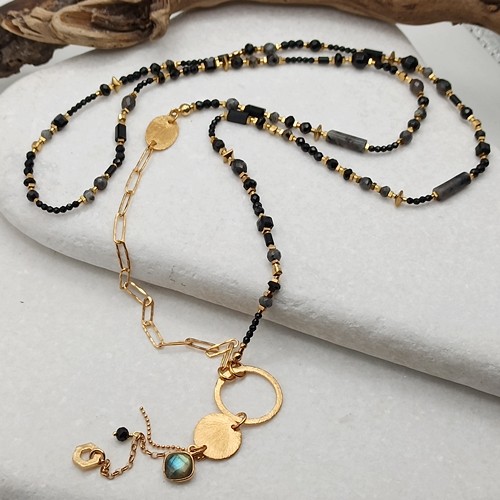 Naszyjnik BlackLove Long, długi, czarne kamienie naturalne, onyks, larvikit, spinel, labradoryt, złocony łańcuch, blaszki, zawieszki