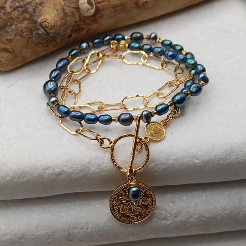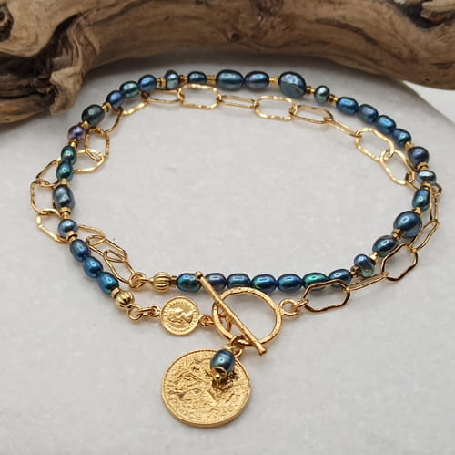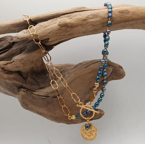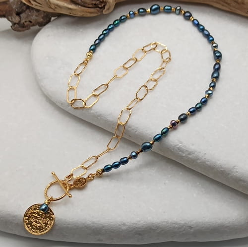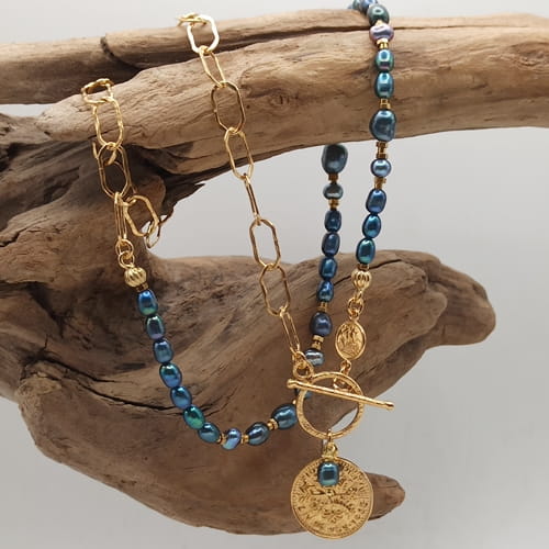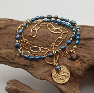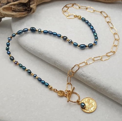 Ręcznie robiony naszyjnik wykonany ze srebra pr. 925, pokrytego złotem, łączy klasyczną elegancję z nowoczesnym charakterem. Asymetryczne połączenie fakturowanych, złoconych ogniw (10x5mm) z delikatnymi naturalnymi perłami różnej wielkości nadaje mu wyrazisty i modny wygląd. Naszyjnik zdobi dwustronna, dekoracyjna moneta (17mm), która symbolizuje obfitość i harmonię. Zapięcie typu toggle (13mm).