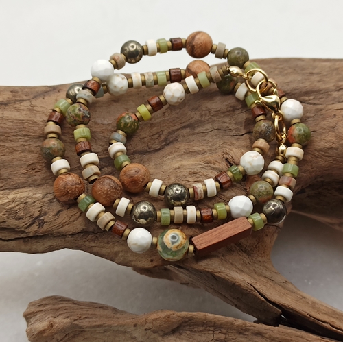 W kompozycji znajdują się starannie dobrane kamienie: jaspis, jaspis tybetański, howlit, chalcedon, piryt oraz hematyt, uzupełnione elementami z egzotycznego drewna. To egzemplarz unikalny, co oznacza, że drugiego takiego nie zrobimy.