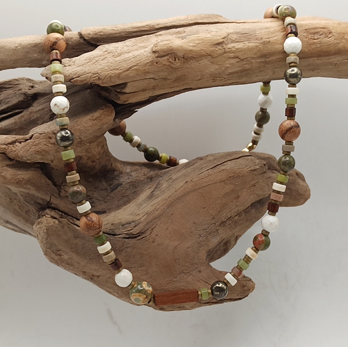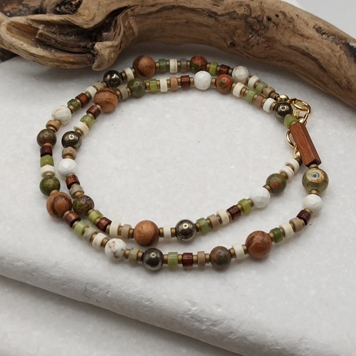 Minimalistyczny, krótki naszyjnik unisex wykonany z naturalnych kamieni (4-8mm) w ciepłych, ziemistych odcieniach. To ponadczasowy dodatek dla osób ceniących harmonię, naturę i subtelną elegancję. Idealnie komponuje się zarówno z codziennymi stylizacjami, jak i bardziej wyrafinowanym lookiem.