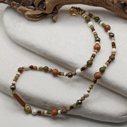 Naszyjnik Earth, męski/damski, krótki, czoker, kamienie w kolorach ziemi, jaspis, howlit, piryt, chalcedon, drewno egzotyczne, hematyt