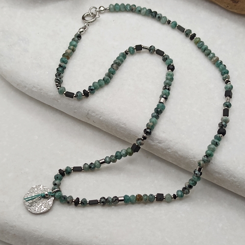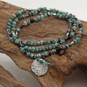 Naszyjnik w stylu boho wykonany ręcznie w jednym egzemplarzu z naturalnych kamieni o subtelnej, pastelowej kolorystyce. Kompozycję tworzą fasetowane oponki agatu w odcieniach zieleni i turkusu (4x3mm), przełamane akcentami matowego czarnego onyksu. Całość dopełnia zawieszka ze stali szlachetnej w formie fakturowanej monety z motywem Hamsy (15mm) - symbolu ochrony i dobrej energii.