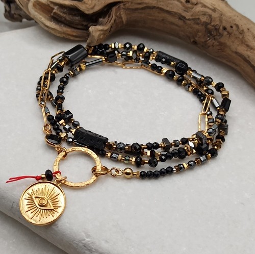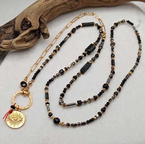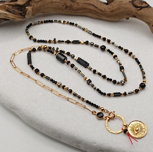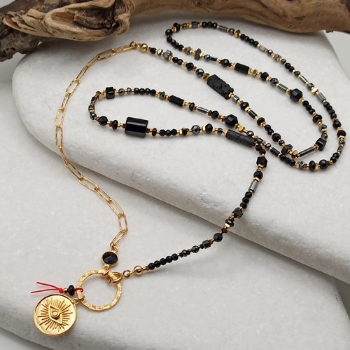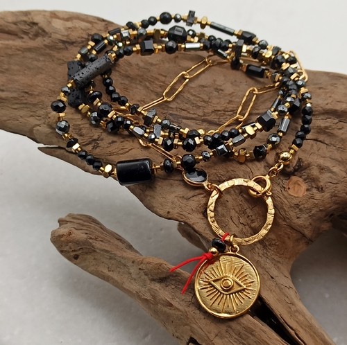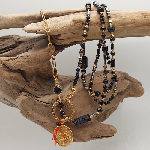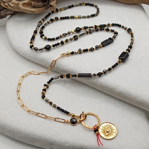 Wyjątkowy naszyjnik łączący styl boho i glamour, wykonany ręcznie z naturalnych, czarnych kamieni o różnorodnych kształtach i fakturach, uzupełniony złoconym łańcuchem o fakturowanych ogniwach (4x11mm), łącznikiem czarnym onyksem w okuciu. Zawieszka – złocona moneta z motywem oka proroka (Oko Fatimy 17mm)- umieszczona jest na fakturowanym dużym kółku (18mm), z czerwoną nitką symbolizującą szczęście i ochronę.