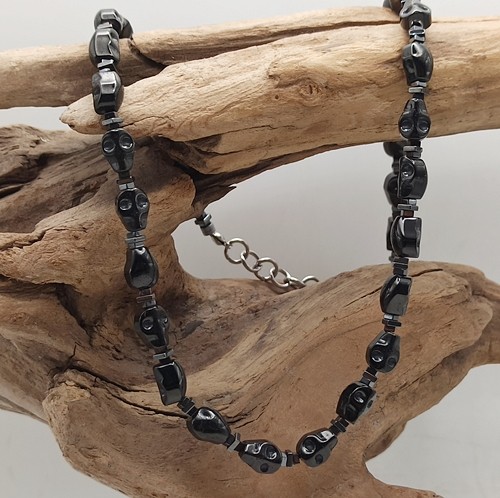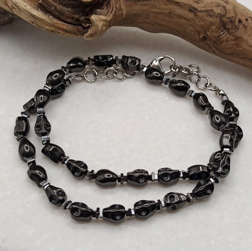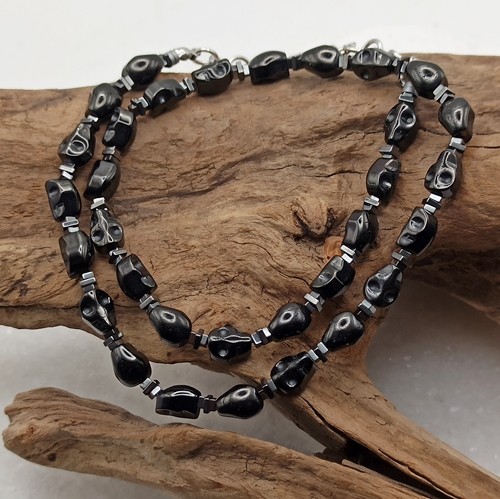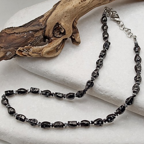 Wyrazisty męski naszyjnik typu choker wykonany ręcznie w jednym egzemplarzu, stworzony dla osób, które cenią mocną symbolikę i unikalny styl. Naszyjnik został wykonany z precyzyjnie rzeźbionych czaszek z hematytu (8x6mm) , a całość wykończono elementami z trwałej stali szlachetnej.