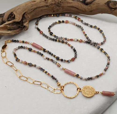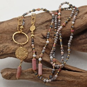 Naszyjnik Soft Harmony, długi, w stylu boho, szare różowe kamienie naturalne, rodonit, larvikit, kwarc, kamień słoneczny, złocony łańcuch, zawieszki, monety