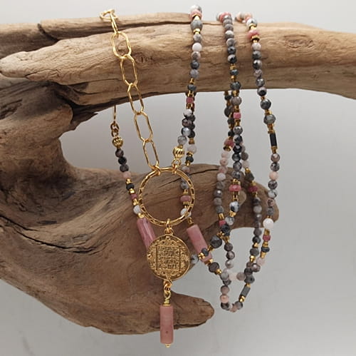 Długi naszyjnik boho handmade wykonany ze srebra pr. 925 złoconego, łączy w sobie naturalne kamienie w stonowanej, kobiecej palecie różu i szarości. Połączenie rodonitu, larvikitu, kwarcu i kamienia słonecznego (3-4mm)tworzy harmonijną kompozycję o subtelnym, ale wyrazistym charakterze. Delikatne kamienie zestawione z fantazyjnym łańcuchem i zawieszką z monetą (15mm) zawieszoną na ozdobnym kółku (śr.20mm) nadają całości lekkości i elegancji. Każdy detal został wykonany ręcznie z dbałością o symbolikę i energię kamieni.