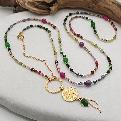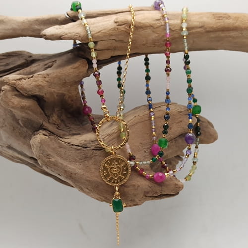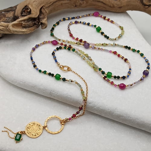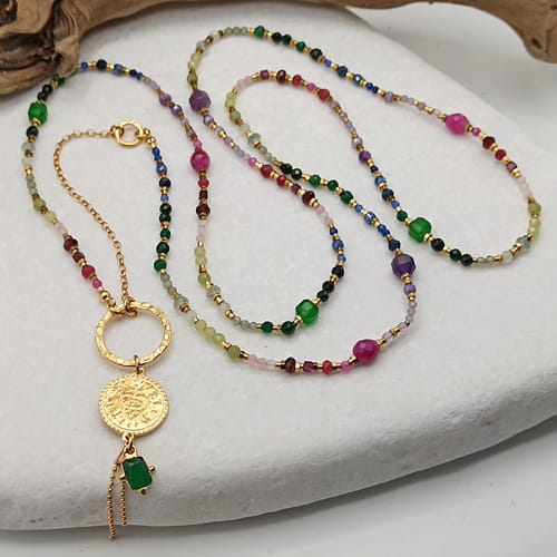 Długi naszyjnik boho handmade, wykonany ręcznie w jednym egzemplarzu, łączy złocone srebro z energetyczną kompozycją naturalnych kamieni. Intensywne odcienie zieleni, różu i fuksji - ametyst, granat, chalcedon, jadeit, oliwin oraz kwarc truskawkowy - tworzą pełną życia, barwną mieszankę o wysokiej wibracji. Fragment naszyjnika zastępuje lekki łańcuszek z ozdobnymi ogniwami, dzięki czemu całość jest bardziej subtelna i komfortowa w noszeniu. Zapinany z przodu na dużym dekoracyjnym kółku, przy którym znajdują się zawieszki: moneta, nieregularne ogniwa, łańcuszki oraz jadeit w okuciu, dodające całości etnicznego charakteru. Idealny talizman dla osób kochających niepowtarzalną biżuterię, naturę i symbolikę kamieni.