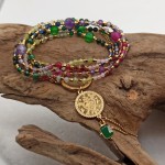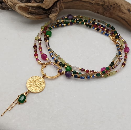 Naszyjnik Viva Gypsy, długi, boho, kolorowe kamieni naturalne, ametyst, granat, chalcedon, jadeit, oliwin, kwarc truskawkowy, złocony łańcuszek z ogniwami, zapinany z przodu, moneta, zawieszki