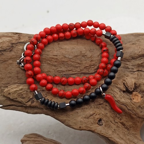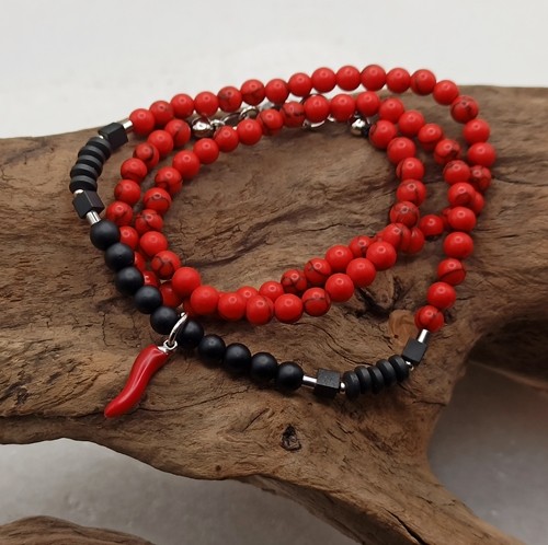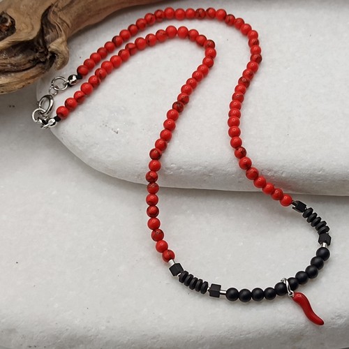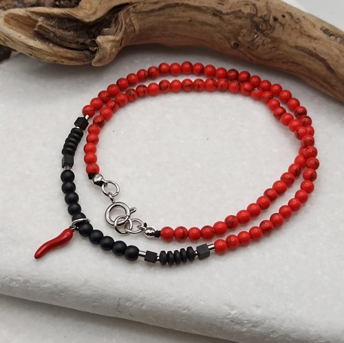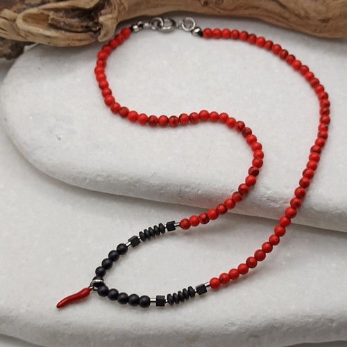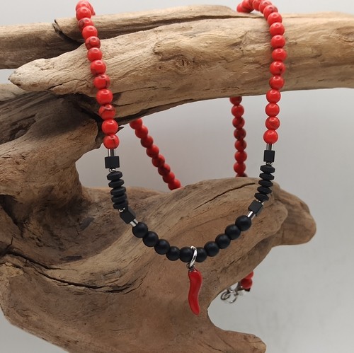 Wyjątkowy krótki naszyjnik unisex wykonany ręcznie, zaprojektowany dla osób, które lubią biżuterię z charakterem i symbolicznym znaczeniem. Kompozycja intensywnie czerwonych kamieni howlitu, matowego czarnego onyksu oraz zawieszki w formie papryczki ze stali szlachetnej tworzy wyrazisty, energetyczny talizman.