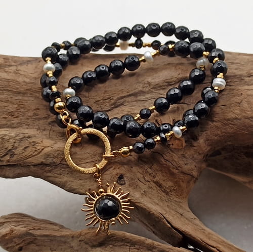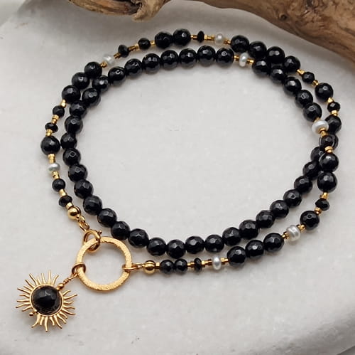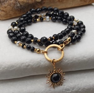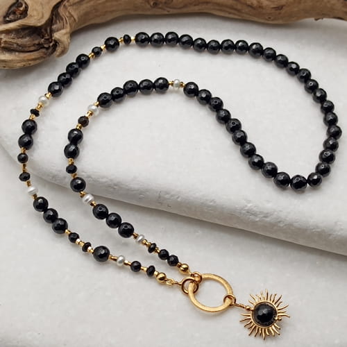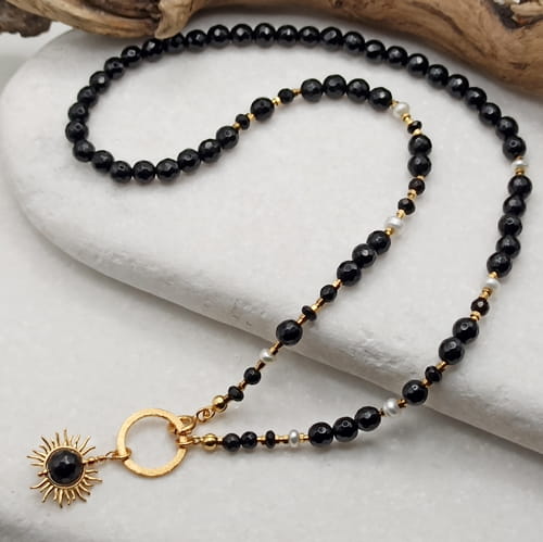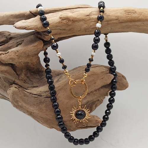 Elegancki naszyjnik z czarnymi kamieniami, stworzony z połączenia onyksem, hematytem i hodowaną perłą. Centralnym elementem jest duże, satynowane kółko z zawieszką w kształcie słońca, które subtelnie otacza kamień, nadając biżuterii wyrazisty charakter. Złocona ozdoba łączy się z głęboką czernią kamieni, tworząc nowoczesny i minimalistyczny design.