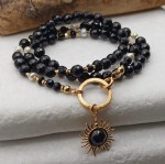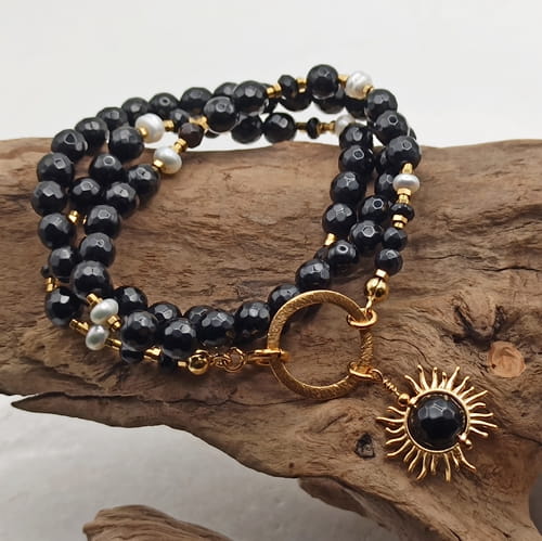 Naszyjnik wykonany ręcznie z fasetowanych onyksów 4-6mm, nieregularnych perełek hodowanych przekładanych krążkami złotego hematytu. Zapinany z przodu na dużym kółku o szczotkowanej fakturze śr.15mm. Zawieszka to okucie do kamieni w formie słońca z fasetowanym onyksem 10mm w środku. Naszyjnik zapakowany w eleganckie pudełko.