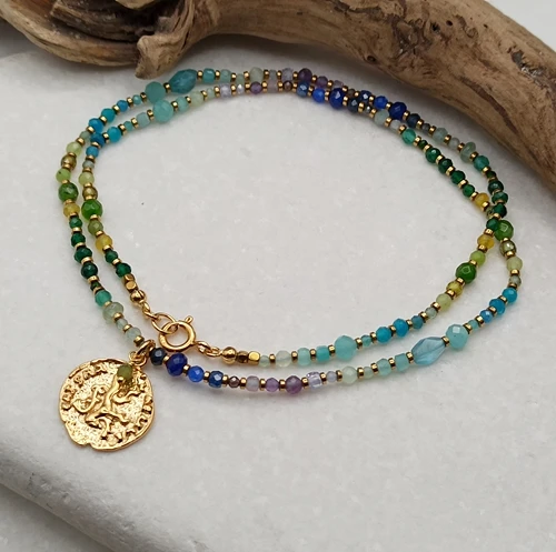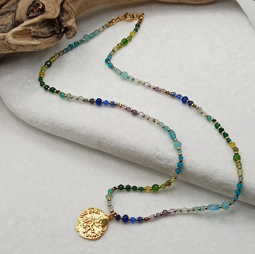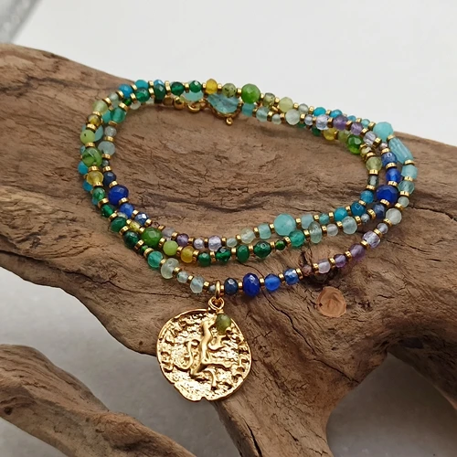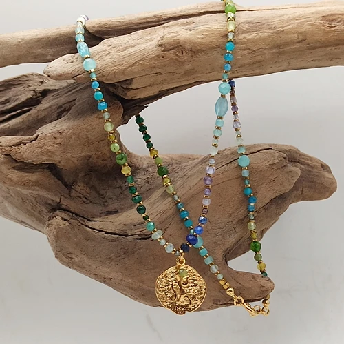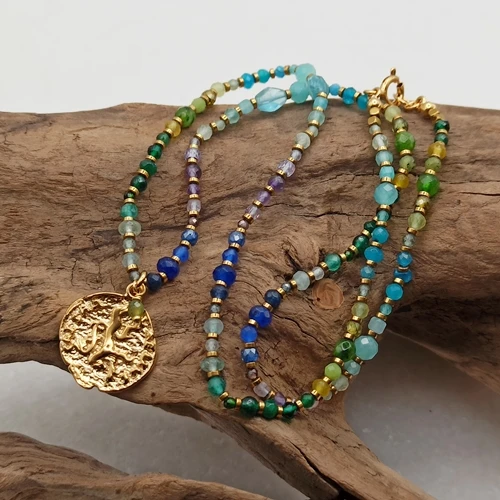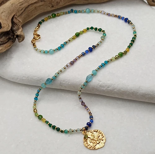 Ręcznie wykonany krótki naszyjnik z kamieni naturalnych (2-4,5mm) w odcieniach zieleni, fioletu, turkusu i błękitu, ozdobiony efektowną złoconą monetą z motywem gryfa (19mm) - mitycznego strażnika, który symbolizuje siłę, odwagę i duchową ochronę.