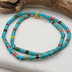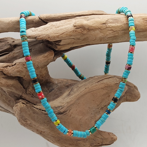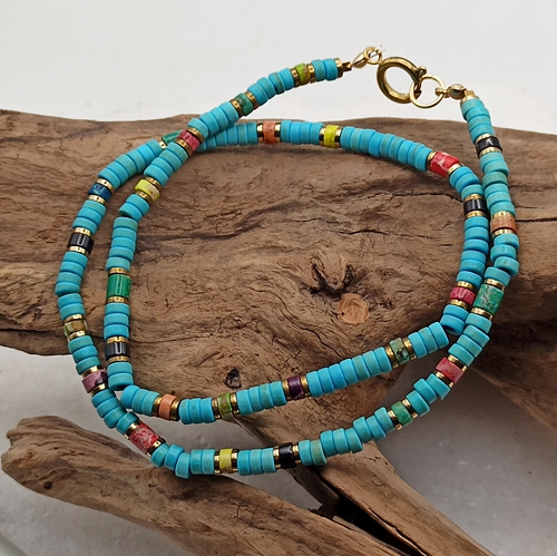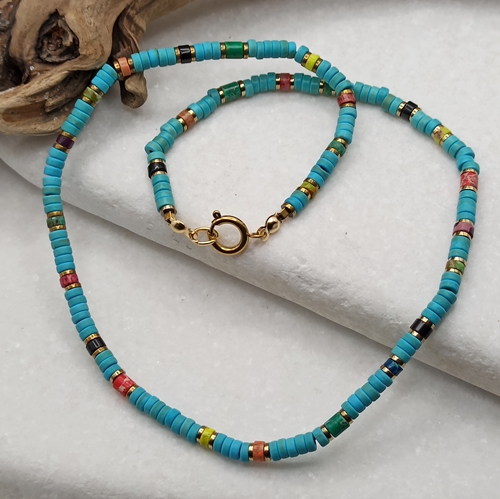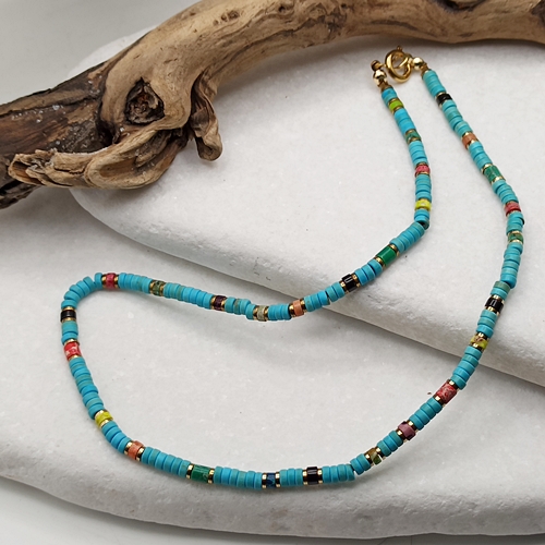 Krótki naszyjnik typu czoker wykonany ręcznie z krążków turkusowego magnezytu (4x2mm)przeplatanych kolorowym jaspisem cesarskim. Prosta, ale wyrazista forma w stylu unisex - idealna zarówno dla niej, jak i dla niego. Biżuteria inspirowana letnią swobodą, naturą i pozytywną energią. Świetnie sprawdzi się jako dodatek do wakacyjnych stylizacji, jak i jako amulet z intencją.