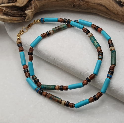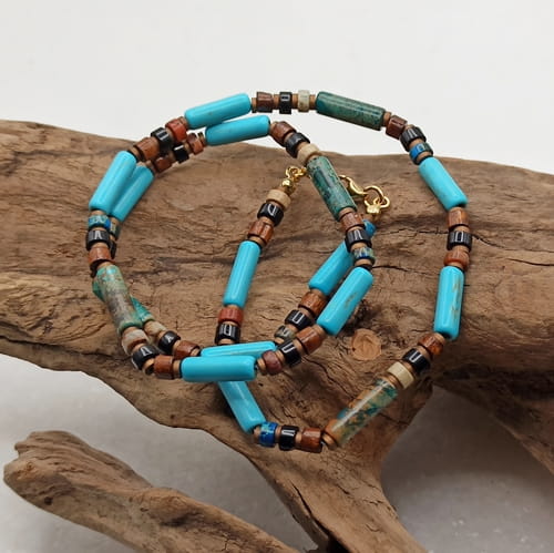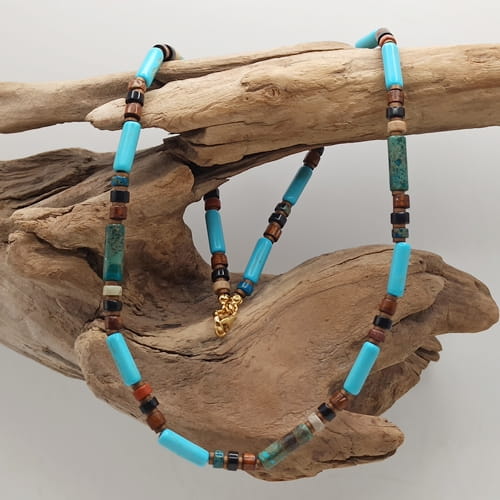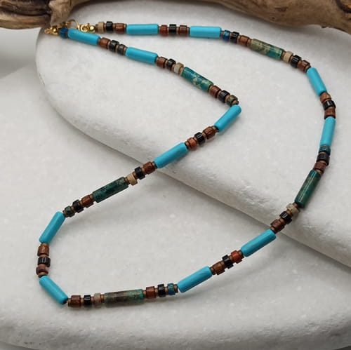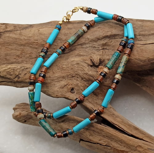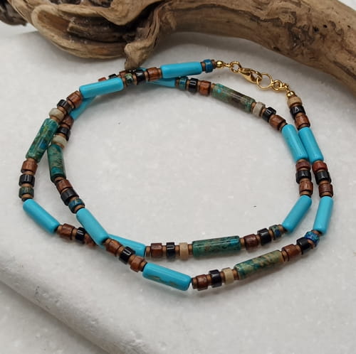 Ten czoker unisex został wykonany ręcznie w jednym egzemplarzu, dzięki czemu masz pewność, że nikt nie będzie nosił identycznego. Połączenie howlitu turkusowego (4x13mm)z jaspisem cesarskim (2x4 i 4x13mm) w brązach i granacie, czarnym onyksem, drewnem wenge i hematytami tworzy naturalną kompozycję inspirowaną ziemią, wodą i ochronną energią minerałów.